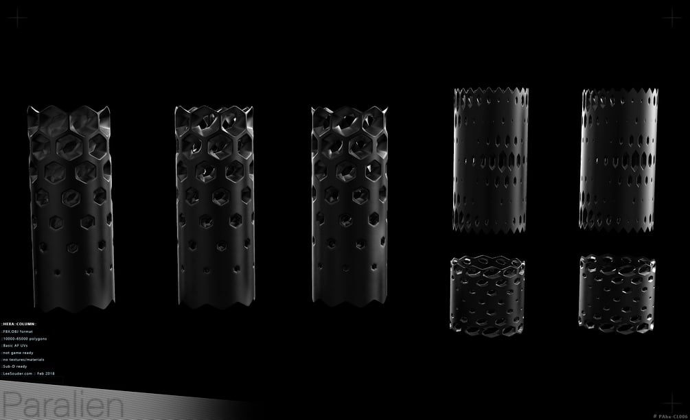 Introducing the Hexagon Nightmare kit! This series revolves around hexagons parametricaly fading around surfaces. Most of the forms have 2 versions: a 1-sided version and a sealed solid version (front and back). Some even have a “capped” version where I filled in the holes. Even though these are highpoly they still have proper edge loops. Every piece can be subdivided. Wire-frames below. The “Combo” parts have a web that can lay flush over the hexagon surface.